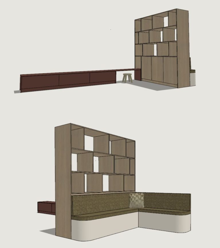 Bij het uitwerken van jou maatwerkmeubels is het belangrijk dat jouw ideeën goed worden overgebracht. Jij deelt je wensen en gedachten en ik vertaal deze naar een 3D-ontwerp met bijbehorende 2D-aanzichten, inclusief duidelijke maatvoering.